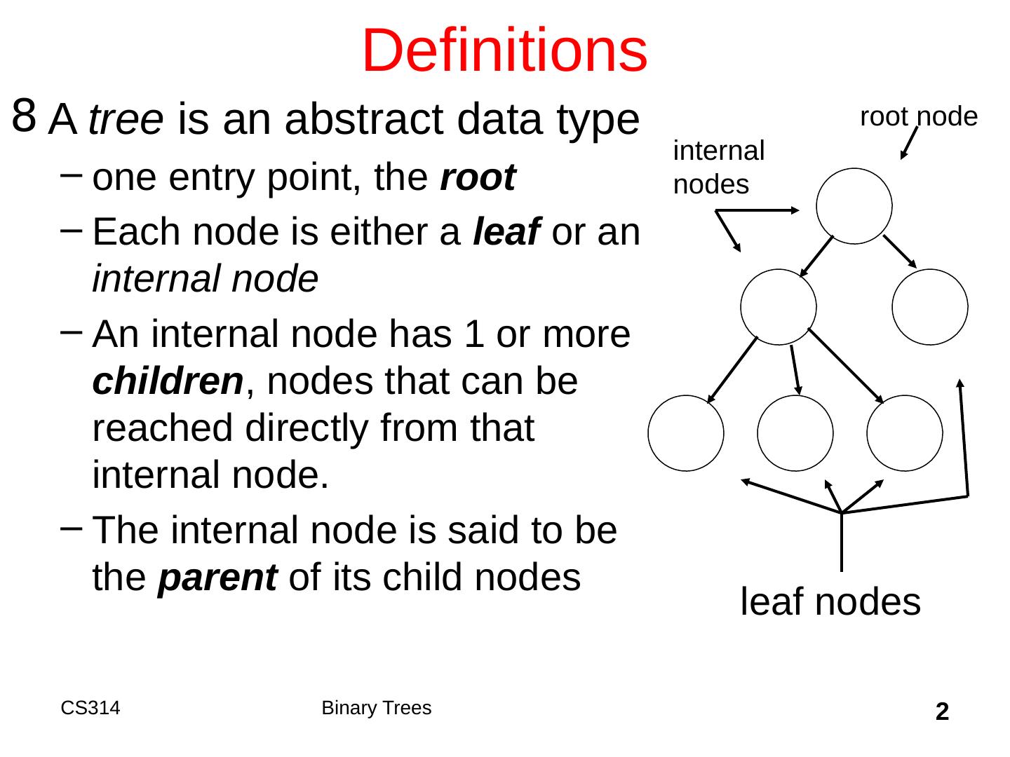2 .2 Definitions A tree is an abstract data type one entry point, the root Each node is either a leaf or an internal node An internal node has 1 or more children , nodes that can be reached directly from that internal node. The internal node is said to be the parent of its child nodes root node leaf nodes internal nodes Binary Trees CS314