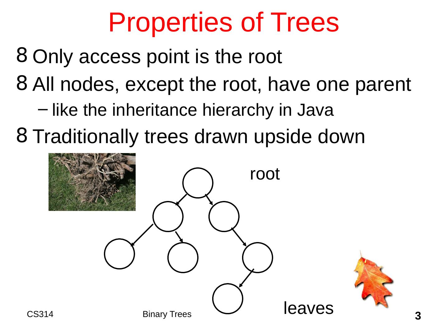 3 .3 Properties of Trees Only access point is the root All nodes, except the root, have one parent like the inheritance hierarchy in Java Traditionally trees drawn upside down root leaves Binary Trees CS314