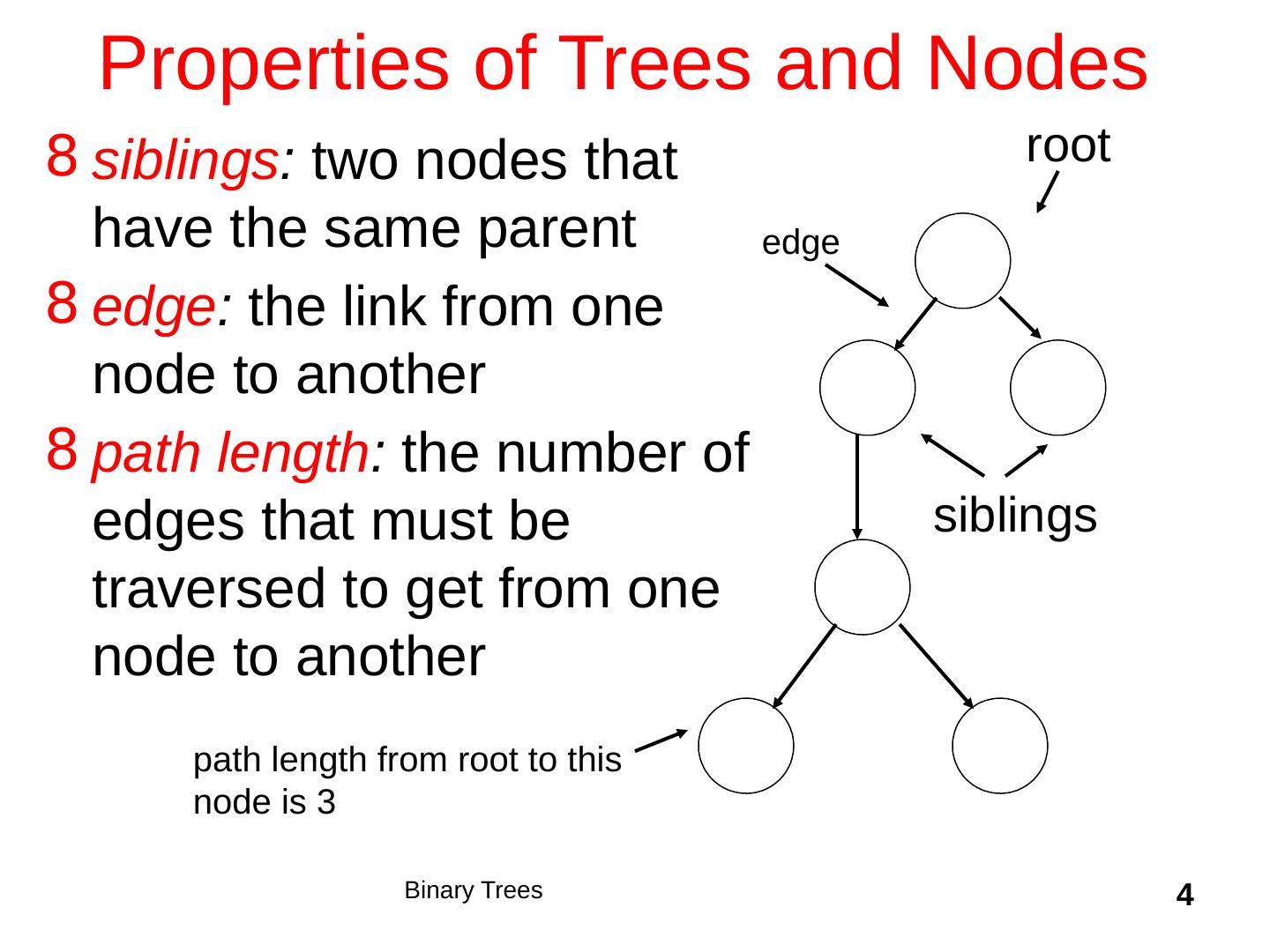 4 .4 Properties of Trees and Nodes siblings : two nodes that have the same parent edge : the link from one node to another path length : the number of edges that must be traversed to get from one node to another root siblings edge path length from root to this node is 3 Binary Trees