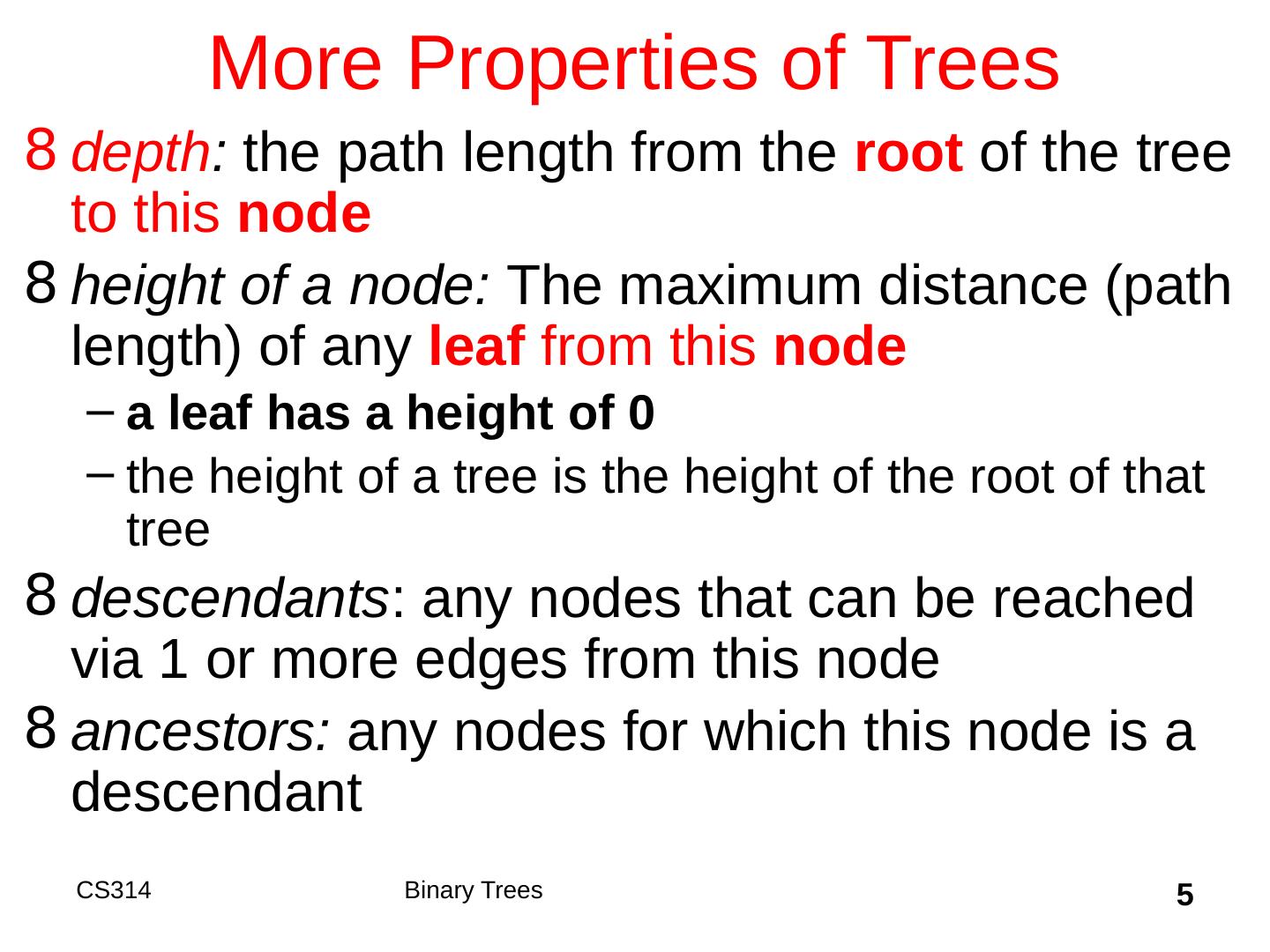 5 .5 More Properties of Trees depth : the path length from the root of the tree to this node height of a node: The maximum distance (path length) of any leaf from this node a leaf has a height of 0 the height of a tree is the height of the root of that tree descendants : any nodes that can be reached via 1 or more edges from this node ancestors: any nodes for which this node is a descendant Binary Trees CS314