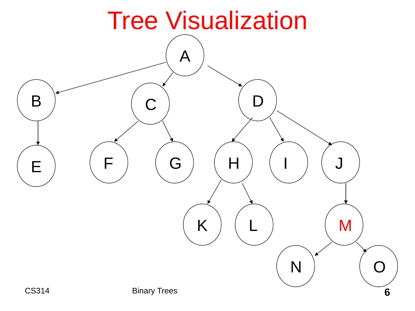 6 .6 Tree Visualization D B C F E A G H J I K L M N O Binary Trees CS314