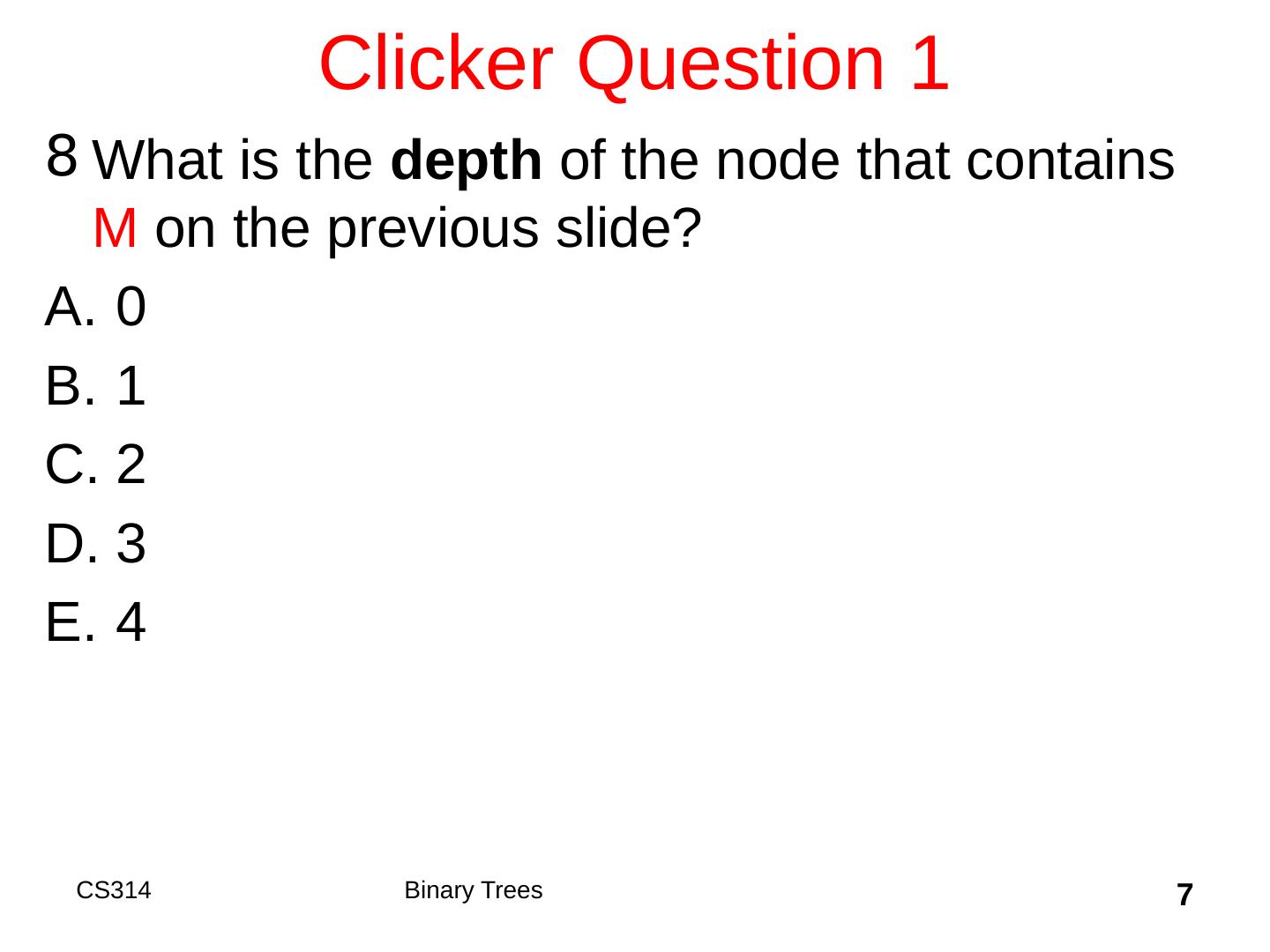 7 .Clicker Question 1 What is the depth of the node that contains M on the previous slide? 0 1 2 3 4 7 Binary Trees CS314