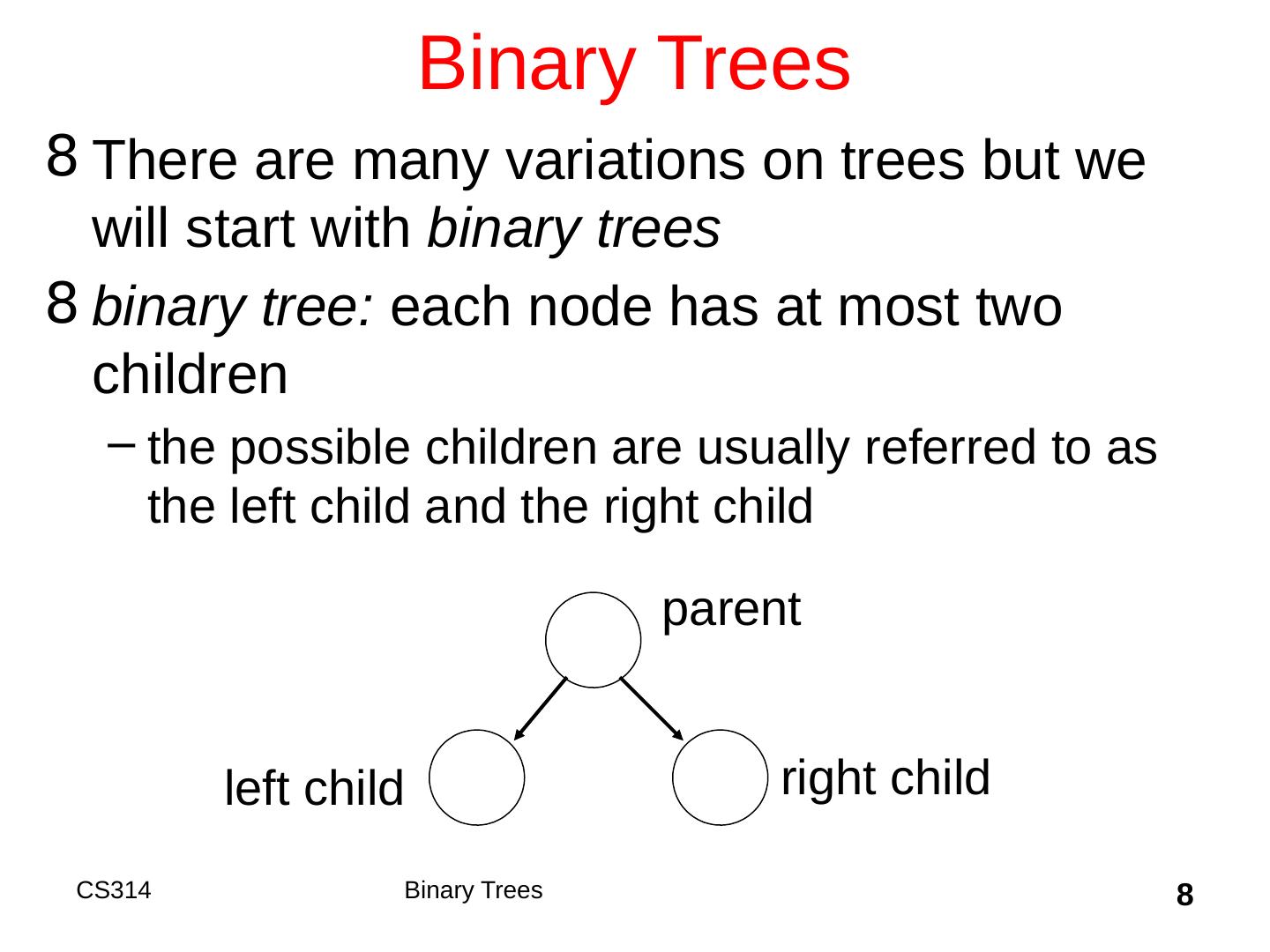 8 .8 Binary Trees There are many variations on trees but we will start with binary trees binary tree: each node has at most two children the possible children are usually referred to as the left child and the right child parent left child right child Binary Trees CS314