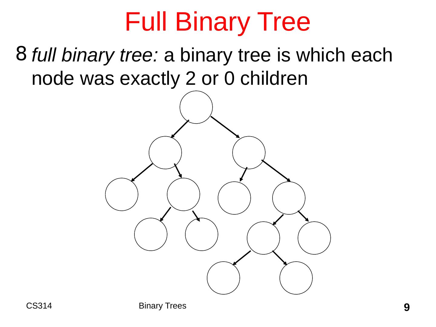 9 .9 Full Binary Tree full binary tree: a binary tree is which each node was exactly 2 or 0 children Binary Trees CS314