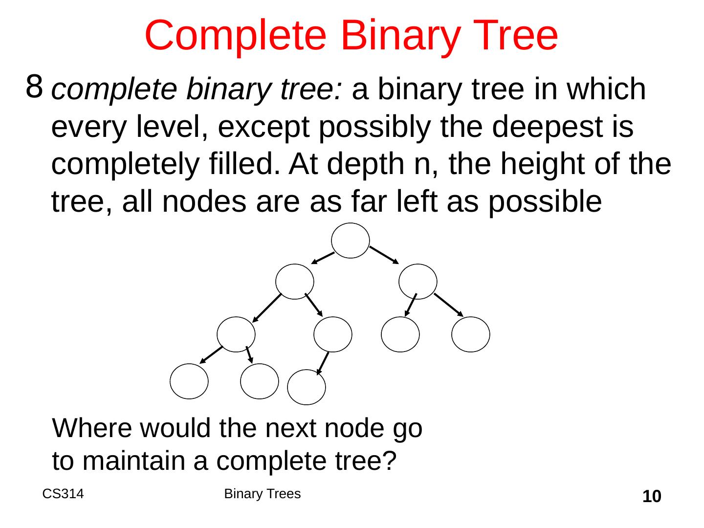 10 .10 Complete Binary Tree complete binary tree: a binary tree in which every level, except possibly the deepest is completely filled. At depth n, the height of the tree, all nodes are as far left as possible Where would the next node go to maintain a complete tree? Binary Trees CS314