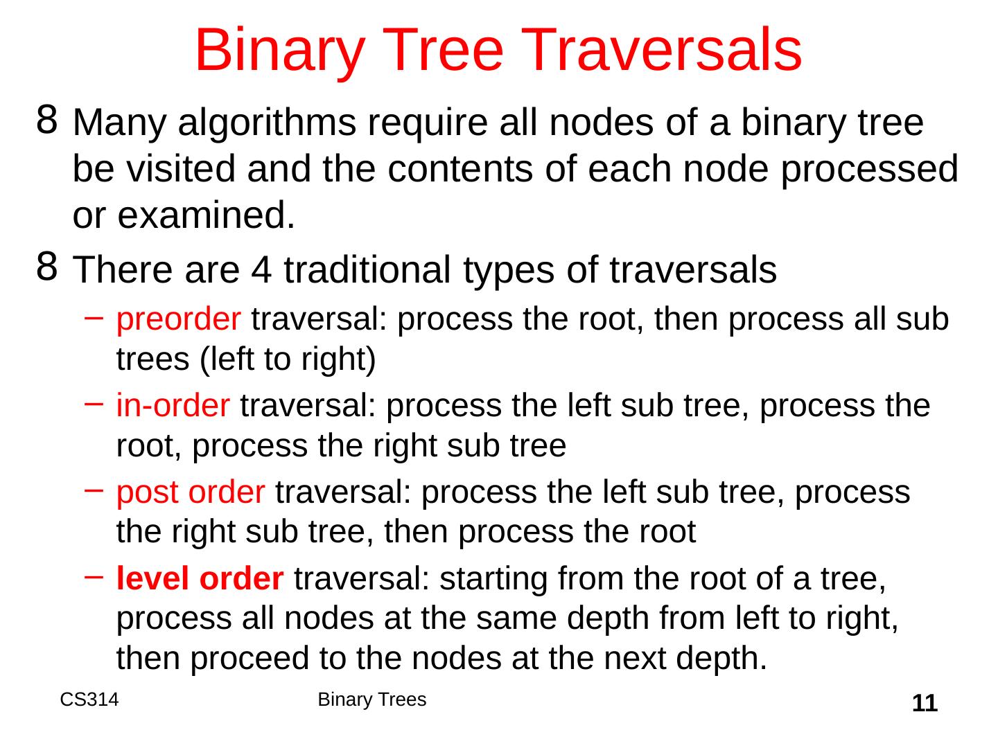 11 .11 Binary Tree Traversals Many algorithms require all nodes of a binary tree be visited and the contents of each node processed or examined. There are 4 traditional types of traversals preorder traversal: process the root, then process all sub trees (left to right) in-order traversal: process the left sub tree, process the root, process the right sub tree post order traversal: process the left sub tree, process the right sub tree, then process the root level order traversal: starting from the root of a tree, process all nodes at the same depth from left to right, then proceed to the nodes at the next depth. Binary Trees CS314