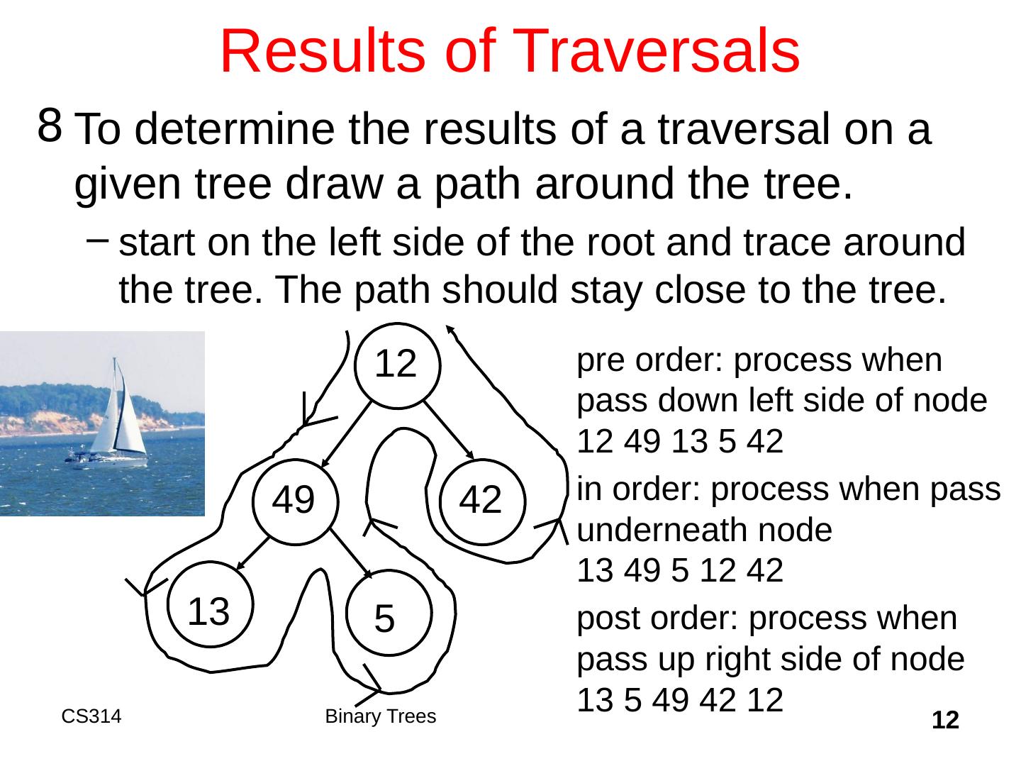 12 .12 Results of Traversals To determine the results of a traversal on a given tree draw a path around the tree. start on the left side of the root and trace around the tree. The path should stay close to the tree. 12 49 42 5 13 pre order: process when pass down left side of node 12 49 13 5 42 in order: process when pass underneath node 13 49 5 12 42 post order: process when pass up right side of node 13 5 49 42 12 Binary Trees CS314
