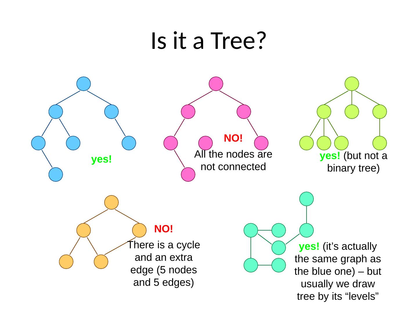 3 .Is it a Tree? yes! NO! All the nodes are not connected NO! There is a cycle and an extra edge (5 nodes and 5 edges) yes! (but not a binary tree) yes! (it’s actually the same graph as the blue one) – but usually we draw tree by its “levels”