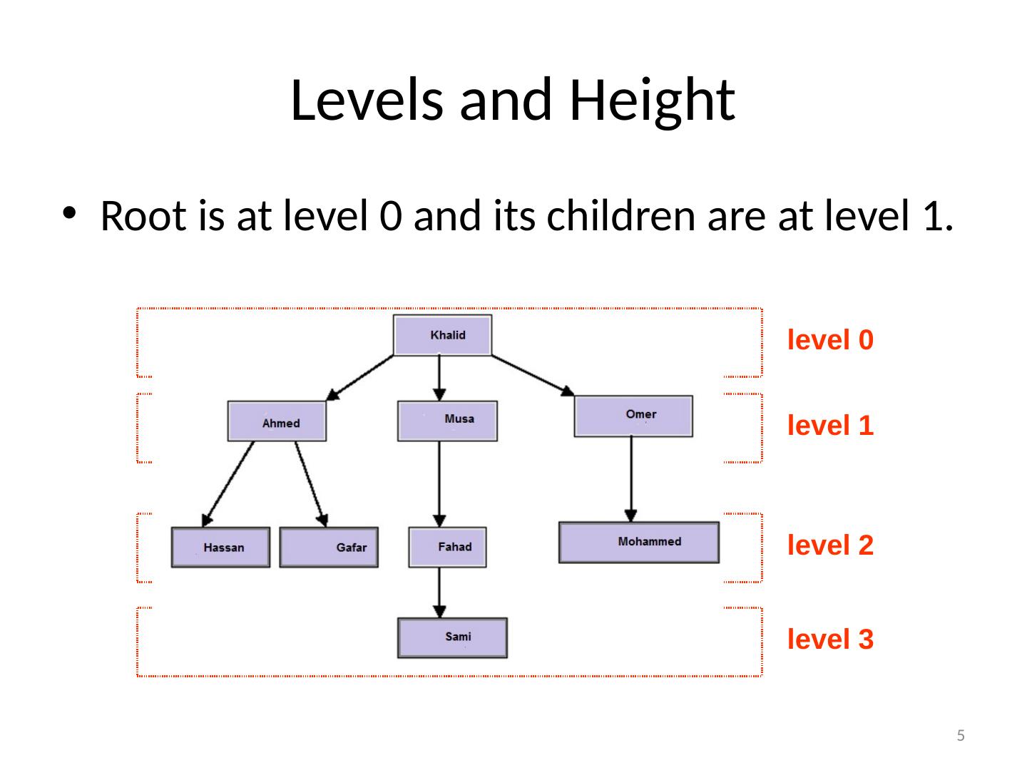 5 .5 Levels and Height Root is at level 0 and its children are at level 1. level 0 level 1 level 2 level 3