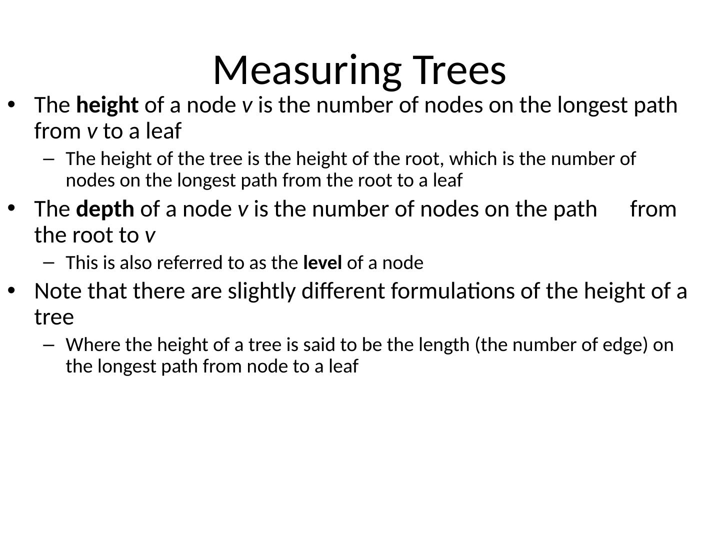 6 .Measuring Trees The height of a node v is the number of nodes on the longest path from v to a leaf The height of the tree is the height of the root, which is the number of nodes on the longest path from the root to a leaf The depth of a node v is the number of nodes on the path from the root to v This is also referred to as the level of a node Note that there are slightly different formulations of the height of a tree Where the height of a tree is said to be the length (the number of edge) on the longest path from node to a leaf