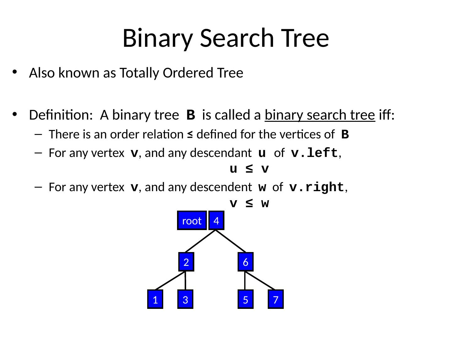 10 .1 3 7 5 Binary Search Tree Also known as Totally Ordered Tree Definition: A binary tree B is called a binary search tree iff: There is an order relation ≤ defined for the vertices of B For any vertex v , and any descendant u of v.left , u ≤ v For any vertex v , and any descendent w of v.right , v ≤ w 4 root 2 6