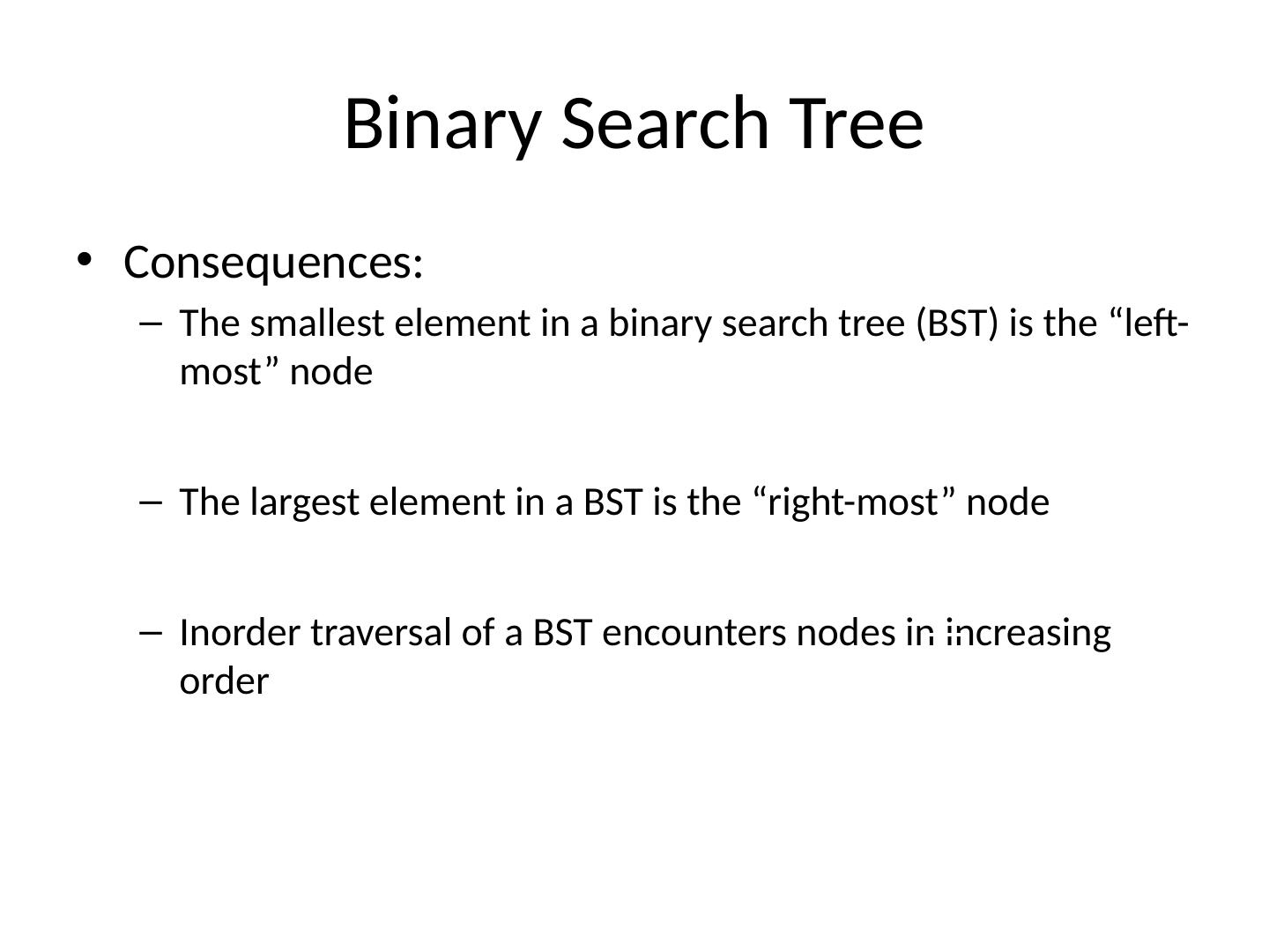 11 .Binary Search Tree Consequences: The smallest element in a binary search tree (BST) is the “left-most” node The largest element in a BST is the “right-most” node Inorder traversal of a BST encounters nodes in increasing order 4 2 6 1 3 7 5 root