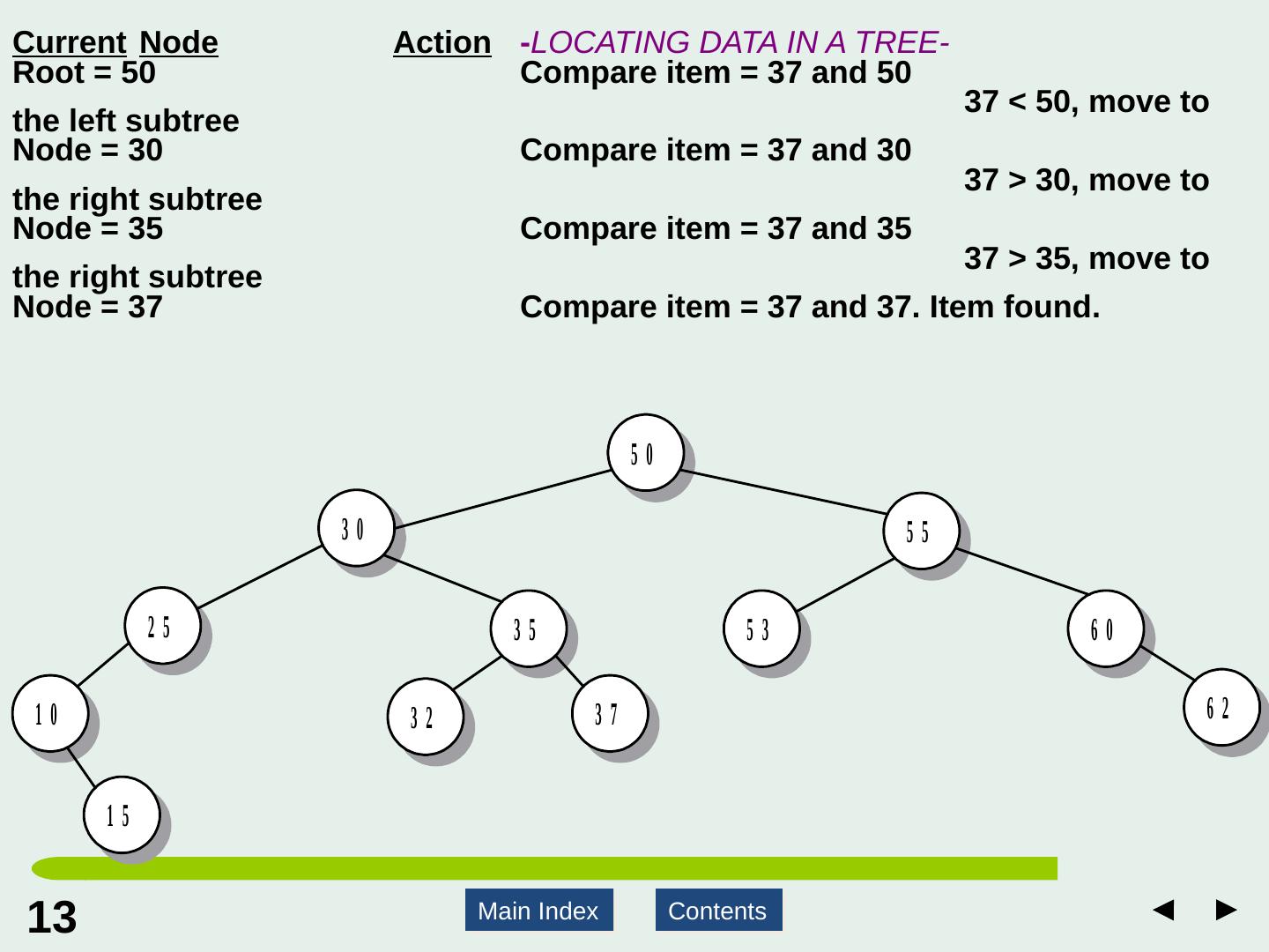 13 .13 13 Main Index Contents Current Node Action - LOCATING DATA IN A TREE- Root = 50 Compare item = 37 and 50 37 < 50, move to the left subtree Node = 30 Compare item = 37 and 30 37 > 30, move to the right subtree Node = 35 Compare item = 37 and 35 37 > 35, move to the right subtree Node = 37 Compare item = 37 and 37. Item found.