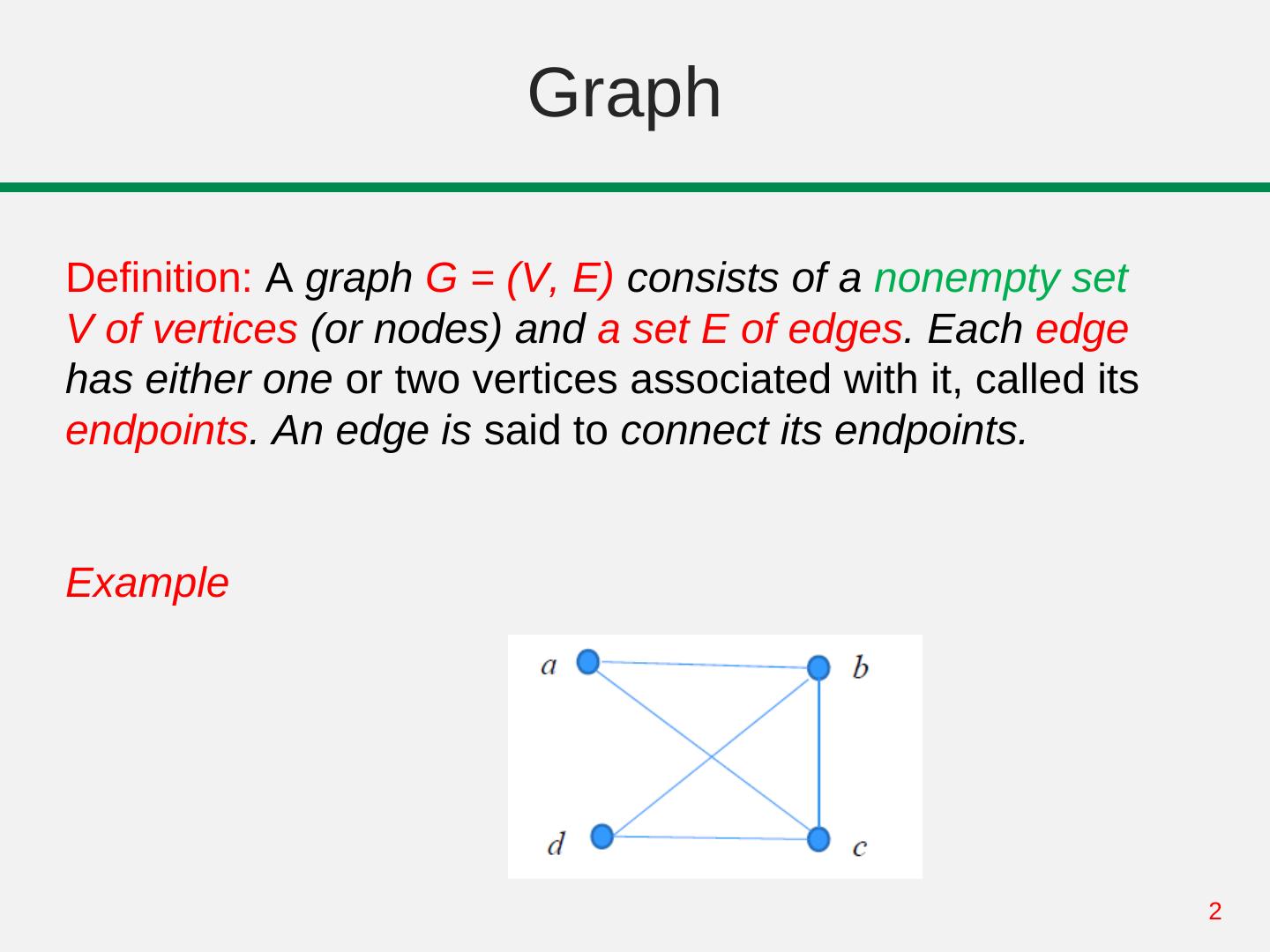 2 . Graph Definition: A graph G = (V, E) consists of a nonempty set V of vertices (or nodes) and a set E of edges. Each edge has either one or two vertices associated with it, called its endpoints. An edge is said to connect its endpoints. Example 2