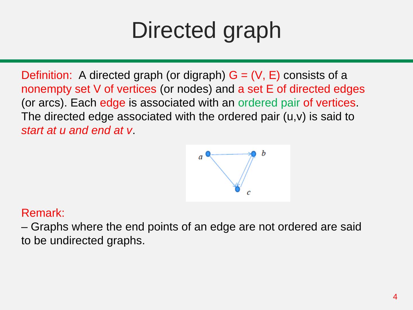 4 . Directed graph Definition: A directed graph (or digraph) G = (V, E) consists of a nonempty set V of vertices (or nodes) and a set E of directed edges (or arcs). Each edge is associated with an ordered pair of vertices. The directed edge associated with the ordered pair (u,v) is said to start at u and end at v. Remark: – Graphs where the end points of an edge are not ordered are said to be undirected graphs. 4