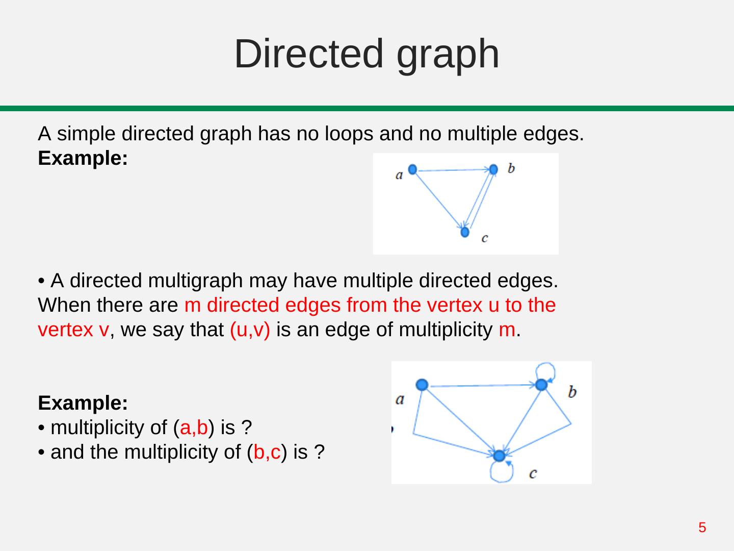 5 . Directed graph A simple directed graph has no loops and no multiple edges. Example: • A directed multigraph may have multiple directed edges. When there are m directed edges from the vertex u to the vertex v, we say that (u,v) is an edge of multiplicity m. Example: • multiplicity of (a,b) is ? • and the multiplicity of (b,c) is ? 5