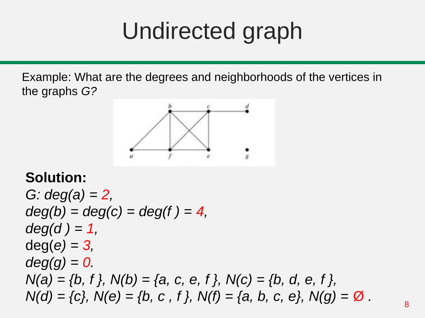 8 . Undirected graph Example: What are the degrees and neighborhoods of the vertices in the graphs G? Solution: G: deg(a) = 2, deg(b) = deg(c) = deg(f ) = 4, deg(d ) = 1, deg(e) = 3, deg(g) = 0. N(a) = {b, f }, N(b) = {a, c, e, f }, N(c) = {b, d, e, f }, N(d) = {c}, N(e) = {b, c , f }, N(f) = {a, b, c, e}, N(g) = Ø . 8