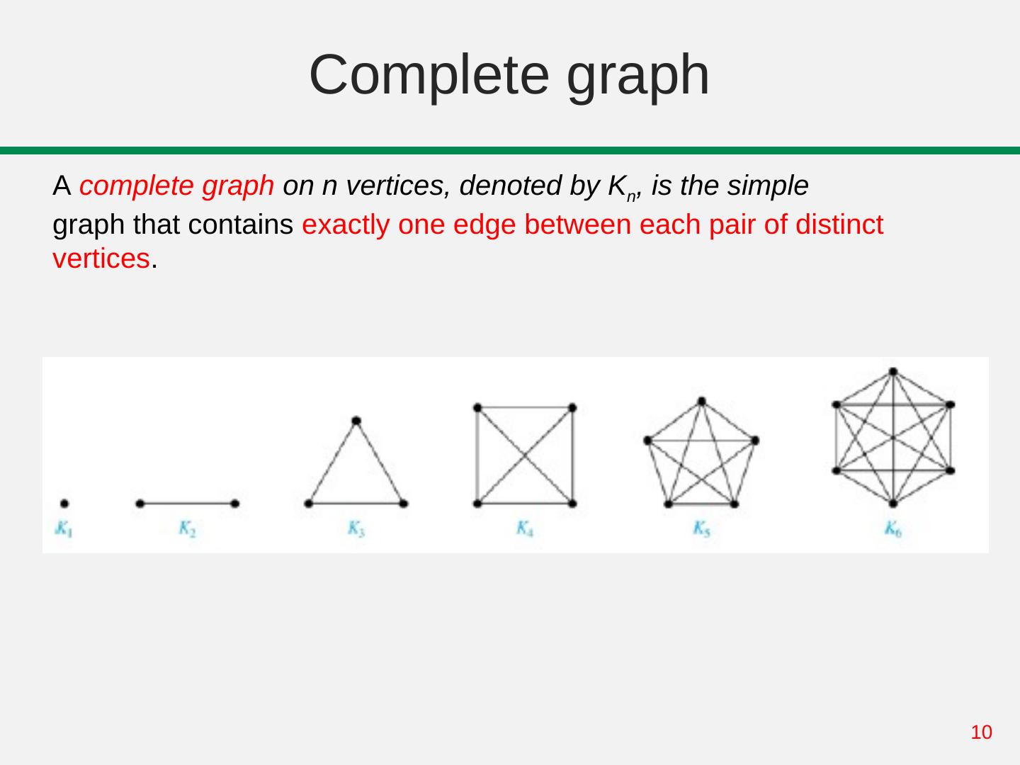 10 . Complete graph A complete graph on n vertices, denoted by Kn, is the simple graph that contains exactly one edge between each pair of distinct vertices. 10