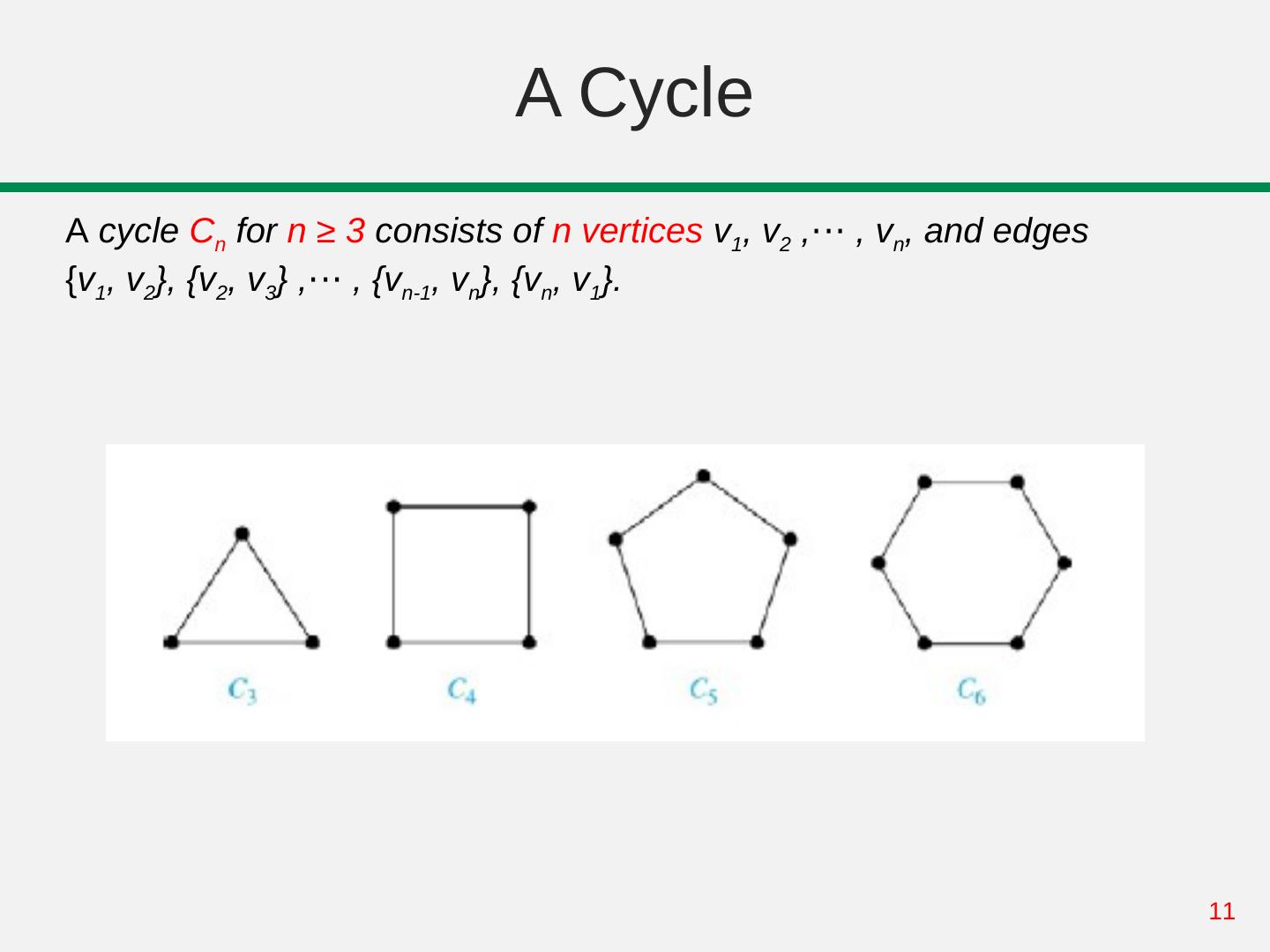 11 . A Cycle A cycle Cn for n ≥ 3 consists of n vertices v1, v2 ,⋯ , v , vn, and edges {v1, v2}, {v2, v3} ,⋯ , v , {vn-1, vn}, {vn, v1}. 11