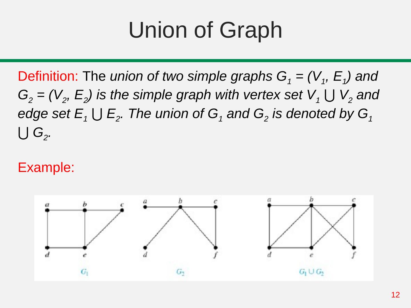12 . Union of Graph Definition: The union of two simple graphs G1 = (V1, E1) and G2 = (V2, E2) is the simple graph with vertex set V1 ⋃ V V2 and edge set E1 ⋃ V E2. The union of G1 and G2 is denoted by G1 ⋃ V G2. Example: 12
