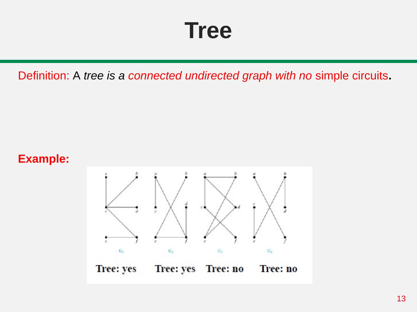 13 . Tree Definition: A tree is a connected undirected graph with no simple circuits. Example: 13