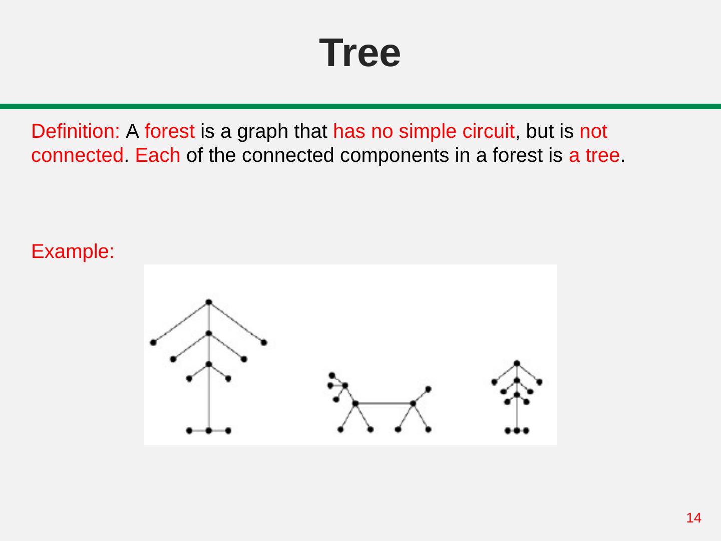 14 . Tree Definition: A forest is a graph that has no simple circuit, but is not connected. Each of the connected components in a forest is a tree. Example: 14