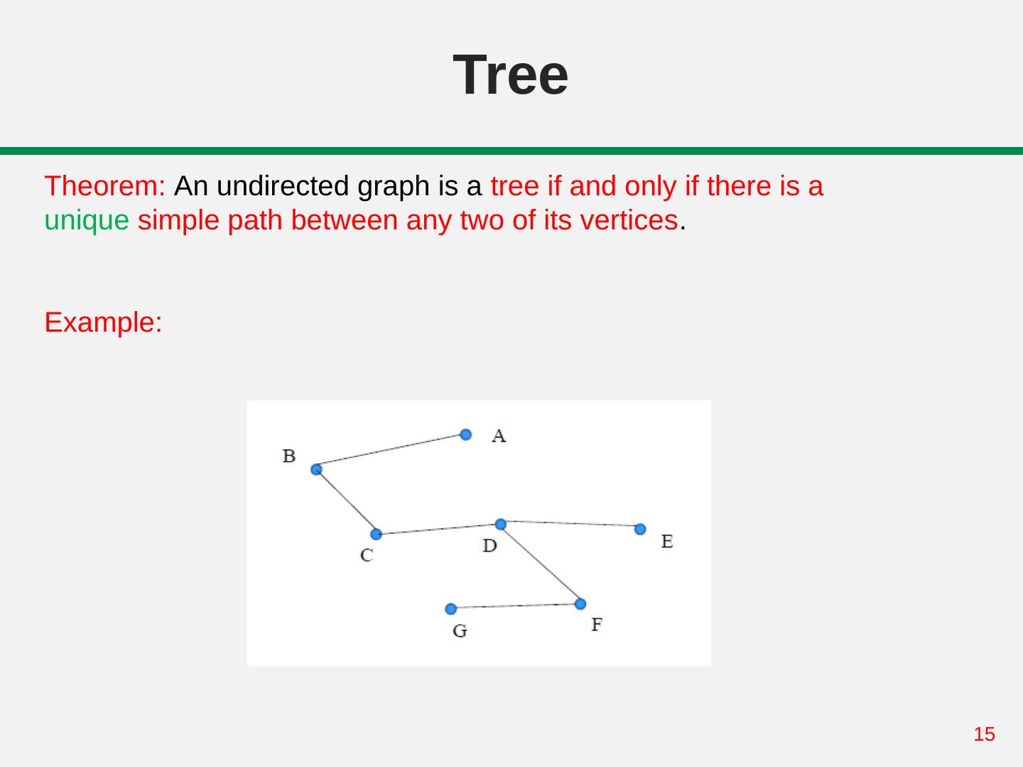 15 . Tree Theorem: An undirected graph is a tree if and only if there is a unique simple path between any two of its vertices. Example: 15