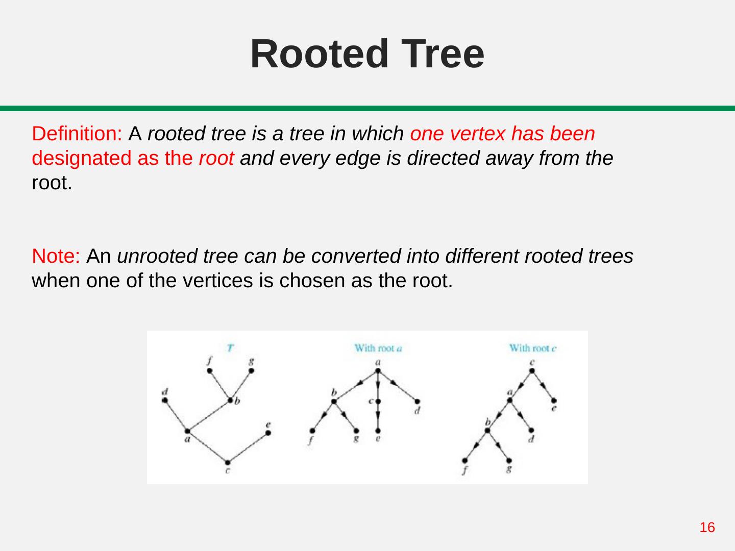 16 . Rooted Tree Definition: A rooted tree is a tree in which one vertex has been designated as the root and every edge is directed away from the root. Note: An unrooted tree can be converted into different rooted trees when one of the vertices is chosen as the root. 16