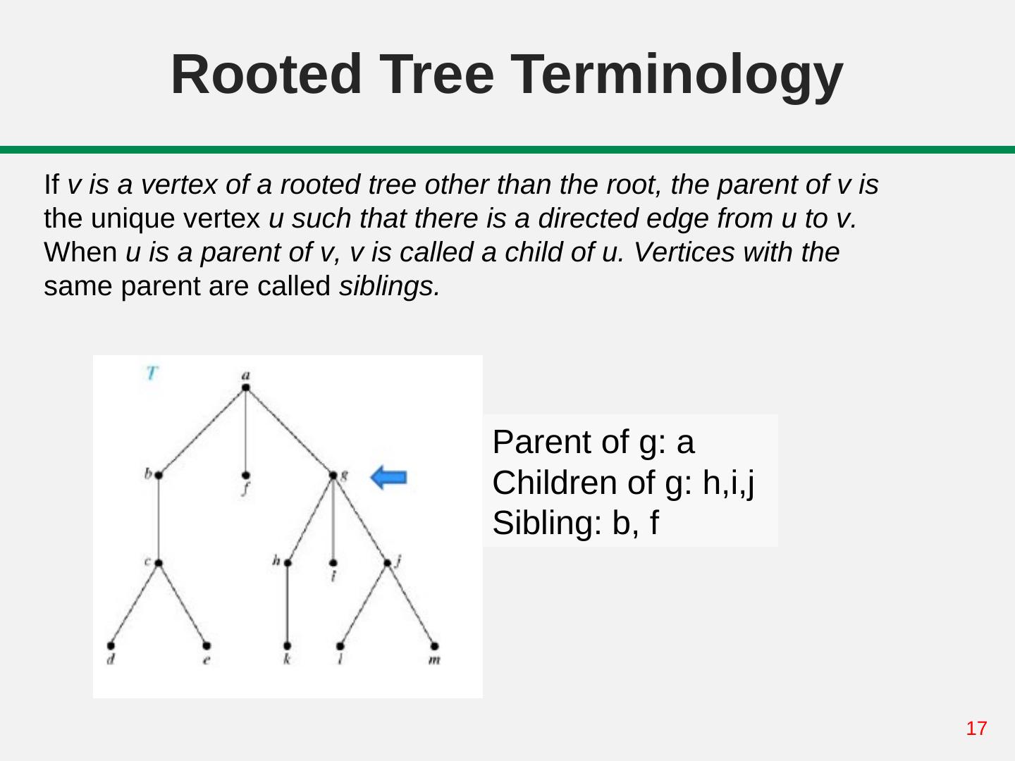 17 . Rooted Tree Terminology If v is a vertex of a rooted tree other than the root, the parent of v is the unique vertex u such that there is a directed edge from u to v. When u is a parent of v, v is called a child of u. Vertices with the same parent are called siblings. Parent of g: a Children of g: h,i,j Sibling: b, f 17