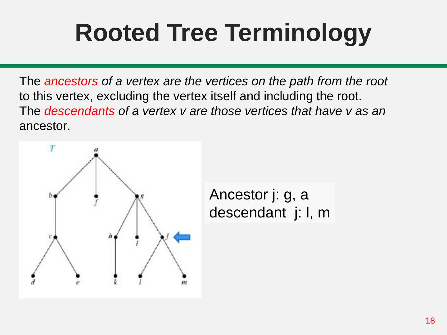 18 . Rooted Tree Terminology The ancestors of a vertex are the vertices on the path from the root to this vertex, excluding the vertex itself and including the root. The descendants of a vertex v are those vertices that have v as an ancestor. Ancestor j: g, a descendant j: l, m 18