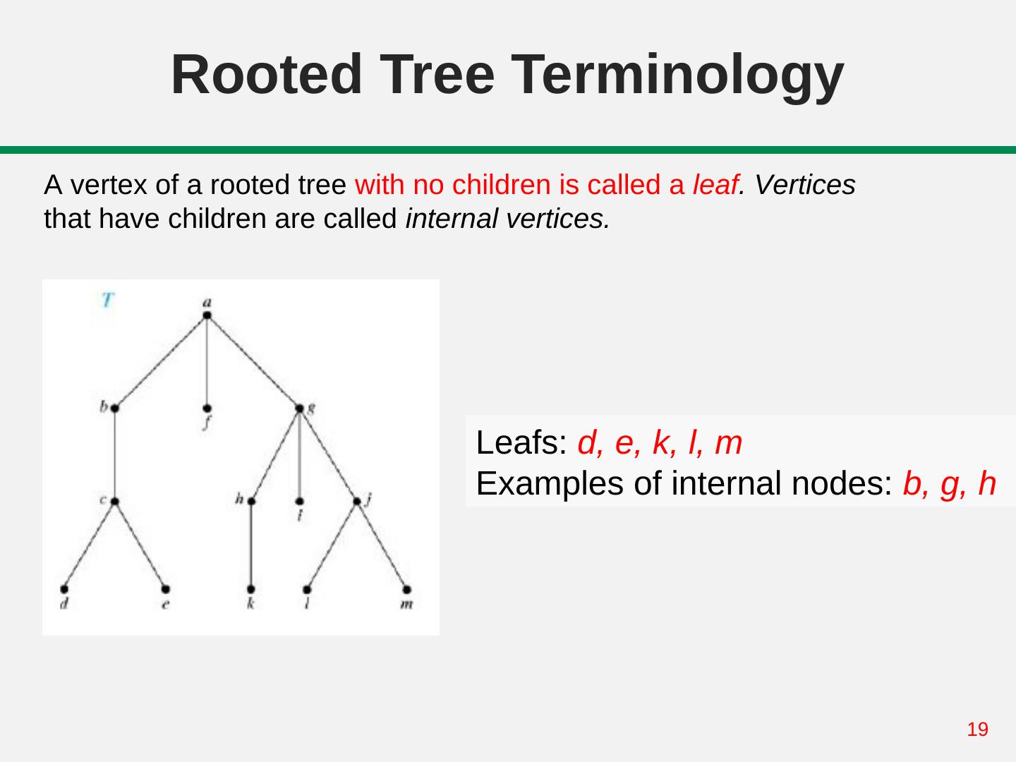 19 . Rooted Tree Terminology A vertex of a rooted tree with no children is called a leaf. Vertices that have children are called internal vertices. Leafs: d, e, k, l, m Examples of internal nodes: b, g, h 19