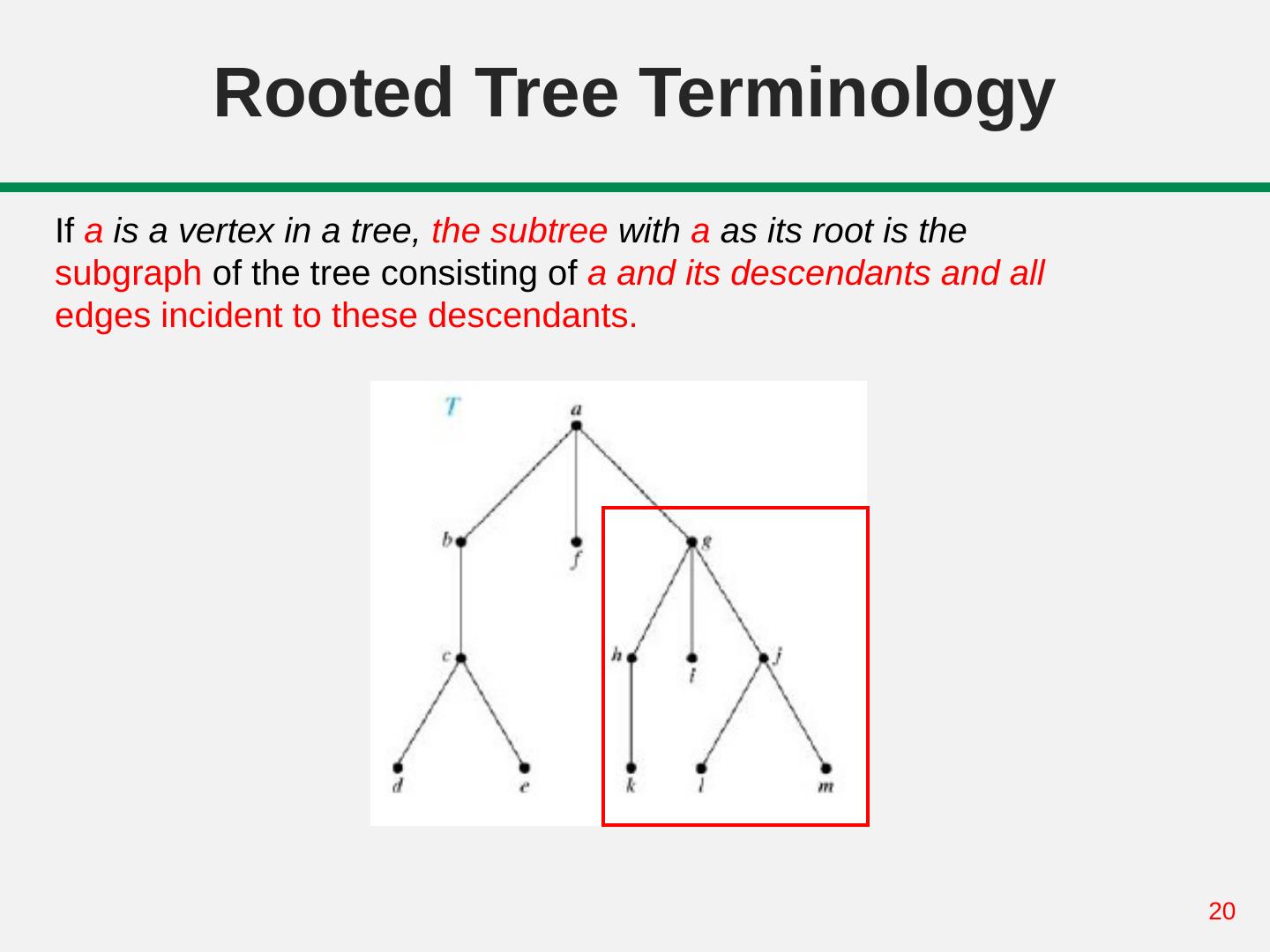20 . Rooted Tree Terminology If a is a vertex in a tree, the subtree with a as its root is the subgraph of the tree consisting of a and its descendants and all edges incident to these descendants. 20