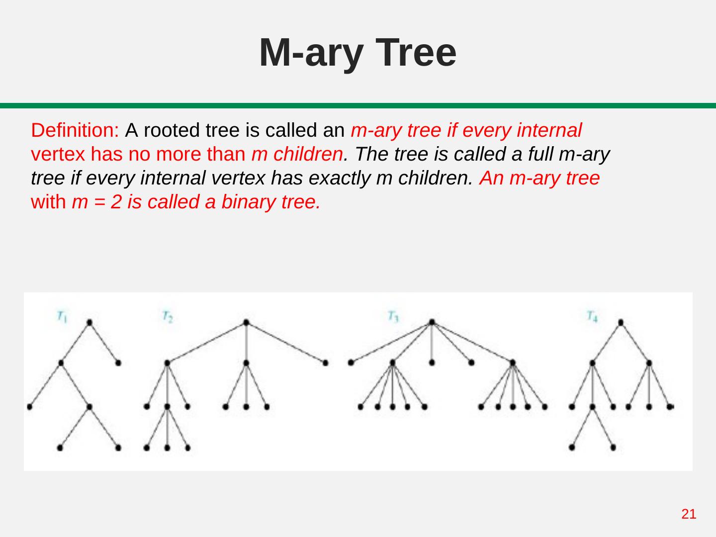 21 . M-ary Tree Definition: A rooted tree is called an m-ary tree if every internal vertex has no more than m children. The tree is called a full m-ary tree if every internal vertex has exactly m children. An m-ary tree with m = 2 is called a binary tree. 21