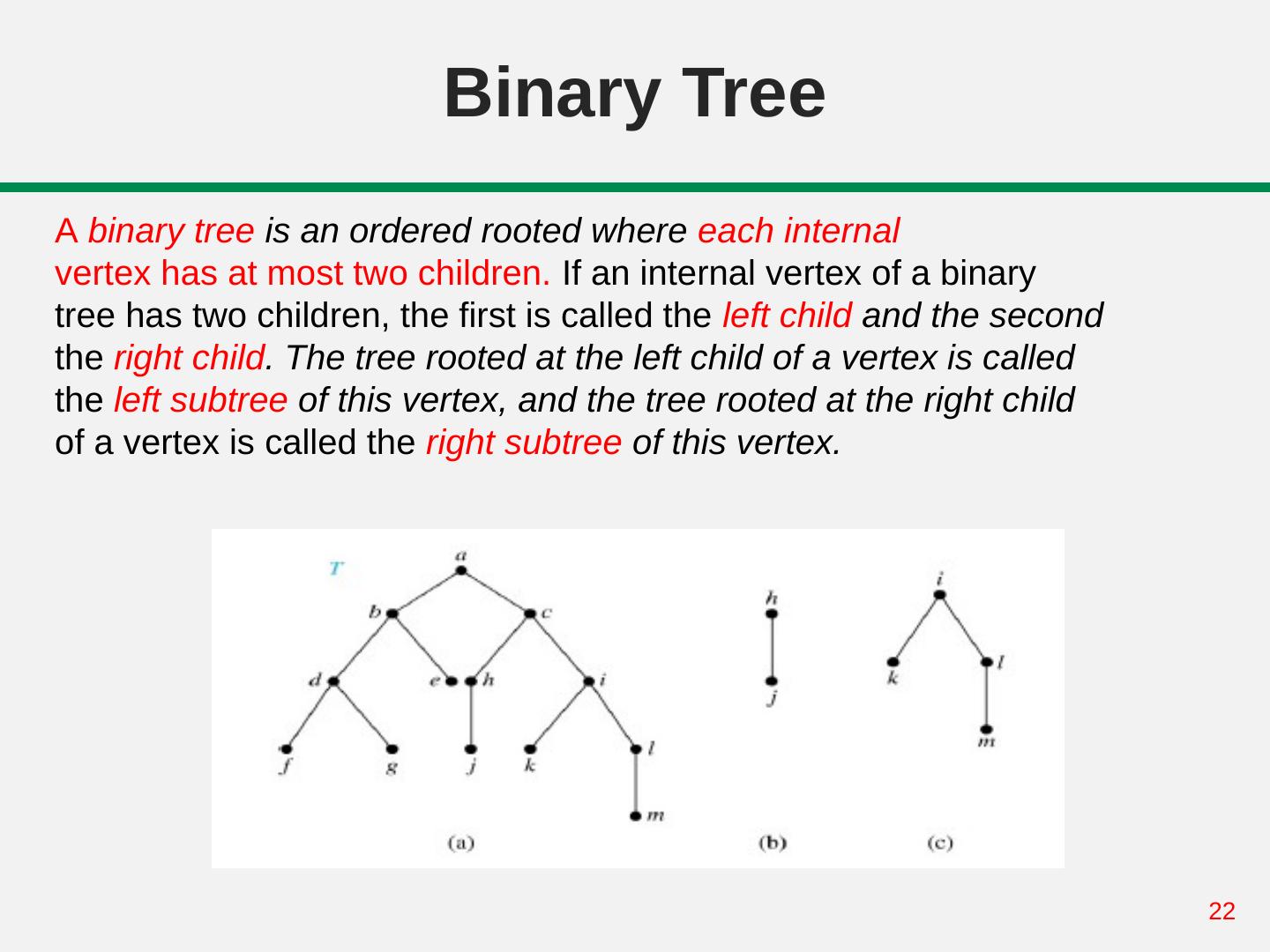 22 . Binary Tree A binary tree is an ordered rooted where each internal vertex has at most two children. If an internal vertex of a binary tree has two children, the first is called the left child and the second the right child. The tree rooted at the left child of a vertex is called the left subtree of this vertex, and the tree rooted at the right child of a vertex is called the right subtree of this vertex. 22