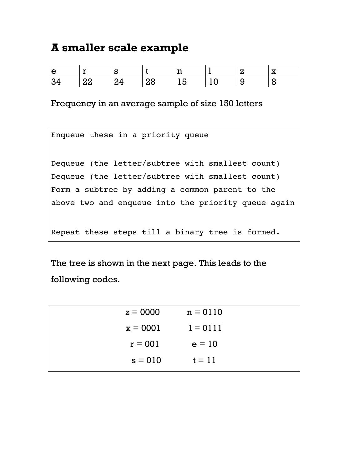 3 .A smaller scale example e r s t n l z x 34 22 24 28 15 10 9 8 Frequency in an average sample of size 150 letters Enqueue these in a priority queue Dequeue (the letter/subtree with smallest count) Dequeue (the letter/subtree with smallest count) Form a subtree by adding a common parent to the above two and enqueue into the priority queue again Repeat these steps till a binary tree is formed. The tree is shown in the next page. This leads to the following codes. z = 0000 n = 0110 x = 0001 l = 0111 r = 001 e = 10 s = 010 t = 11