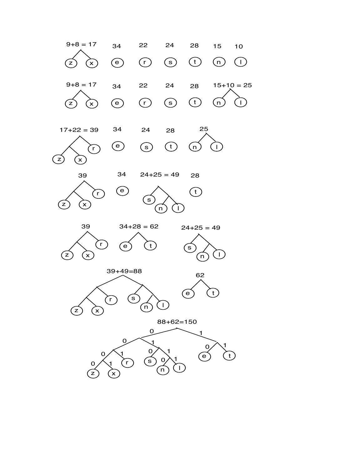 4 . 9+8 = 17 34 22 24 28 15 10 z x e r s t n l 9+8 = 17 34 22 24 28 15+10 = 25 z x e r s t n l 17+22 = 39 34 24 28 25 e s t n l r z x 39 34 24+25 = 49 28 e t r s z x n l 39 34+28 = 62 24+25 = 49 r e t s z x n l 39+49=88 62 e t r s n l z x 88+62=150 0 1 0 1 0 1 1 0 1 0 e t s 0 1 0 1 r n l z x