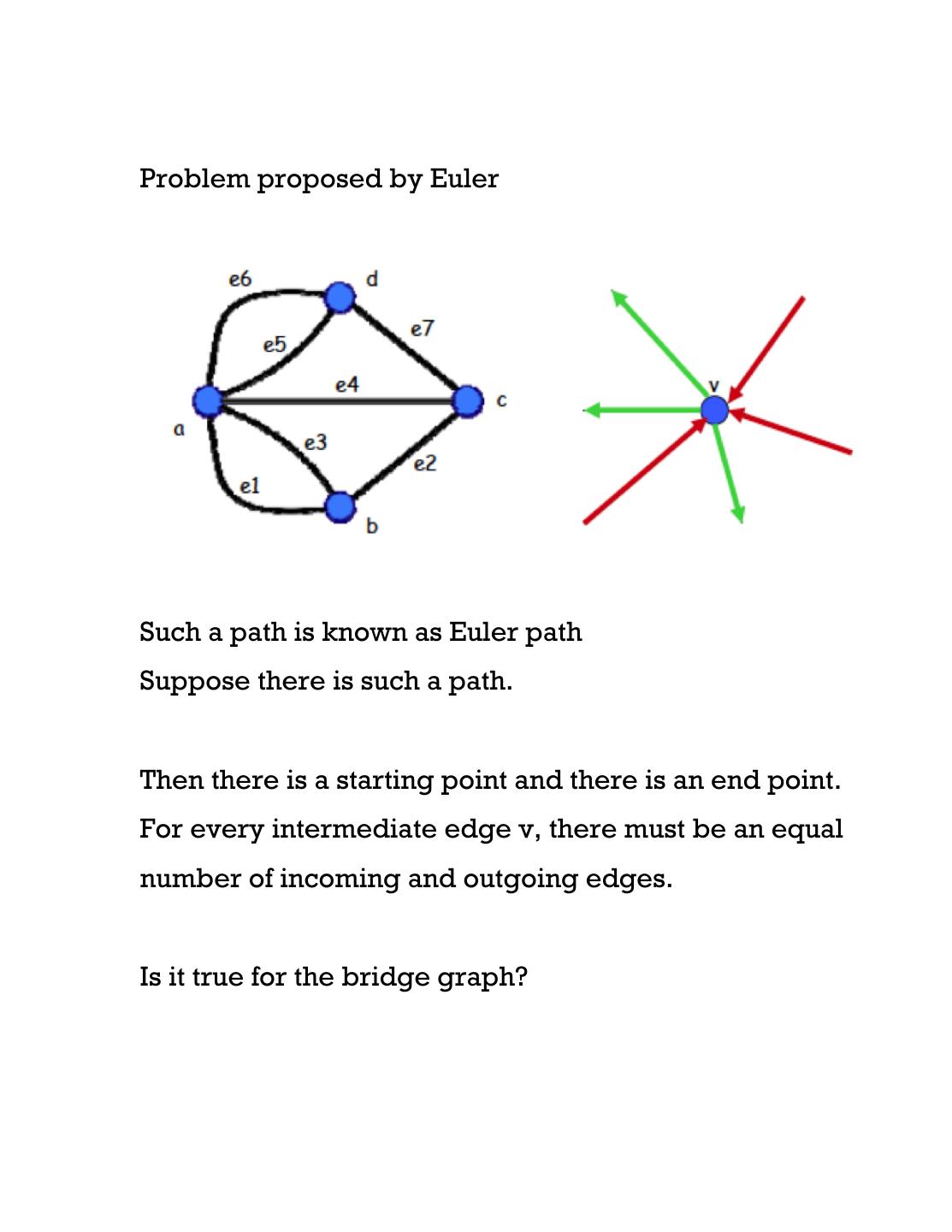 2 .Problem proposed by Euler Such a path is known as Euler path Suppose there is such a path. Then there is a starting point and there is an end point. For every intermediate edge v, there must be an equal number of incoming and outgoing edges. Is it true for the bridge graph?