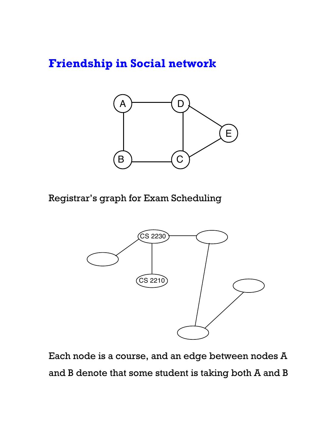 3 .Friendship in Social network A D E B C Registrar’s graph for Exam Scheduling CS 2230 CS 2210 Each node is a course, and an edge between nodes A and B denote that some student is taking both A and B