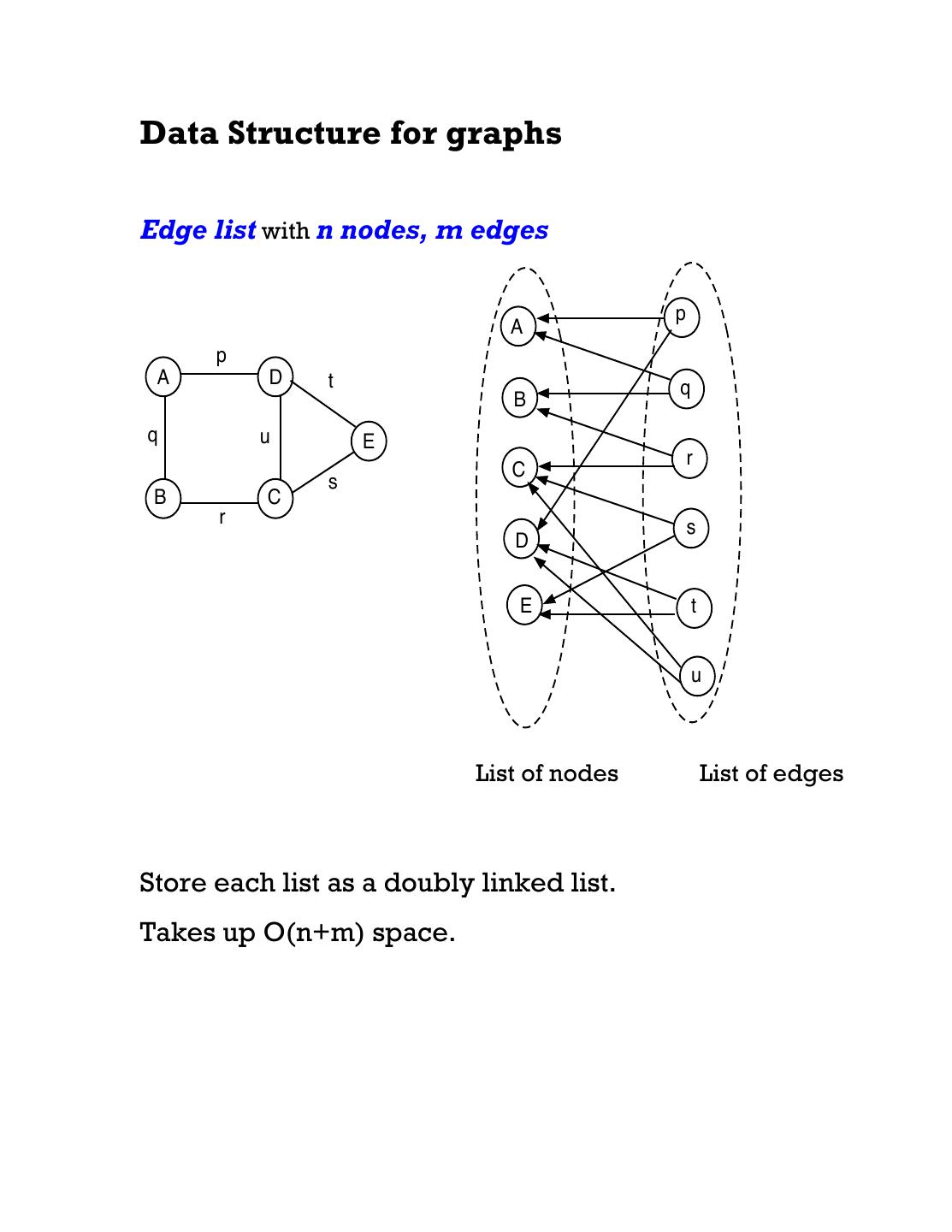 7 .Data Structure for graphs Edge list with n nodes, m edges p A p A D t q B q u E r C s B C r s D E t u List of nodes List of edges Store each list as a doubly linked list. Takes up O(n+m) space.