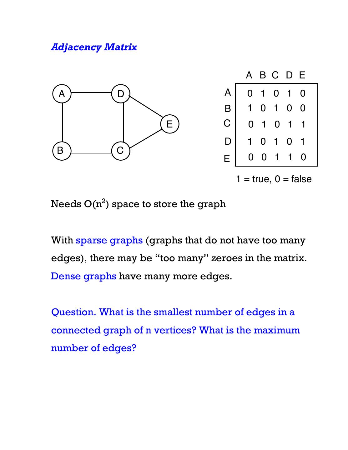 8 .Adjacency Matrix A B C D E A D A 0 1 0 1 0 B 1 0 1 0 0 E C 0 1 0 1 1 D 1 0 1 0 1 B C E 0 0 1 1 0 1 = true, 0 = false Needs O(n2) space to store the graph With sparse graphs (graphs that do not have too many edges), there may be “too many” zeroes in the matrix. Dense graphs have many more edges. Question. What is the smallest number of edges in a connected graph of n vertices? What is the maximum number of edges?