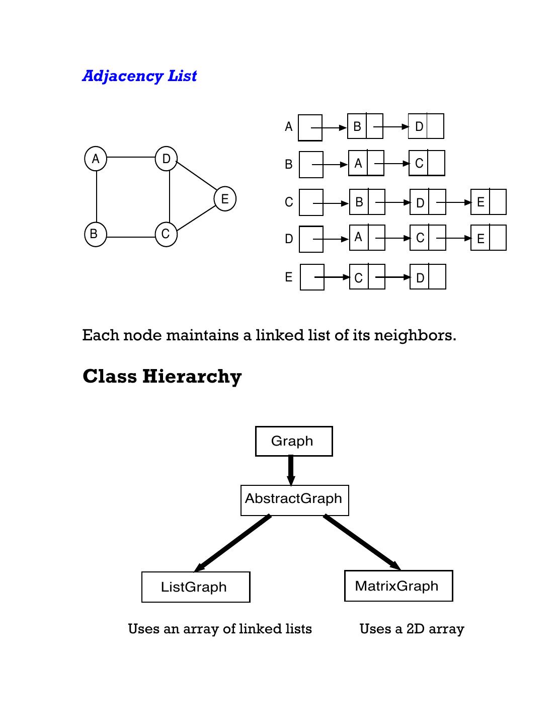 9 .Adjacency List A B D A D B A C E C B D E B C D A C E E C D Each node maintains a linked list of its neighbors. Class Hierarchy Graph AbstractGraph ListGraph MatrixGraph Uses an array of linked lists Uses a 2D array