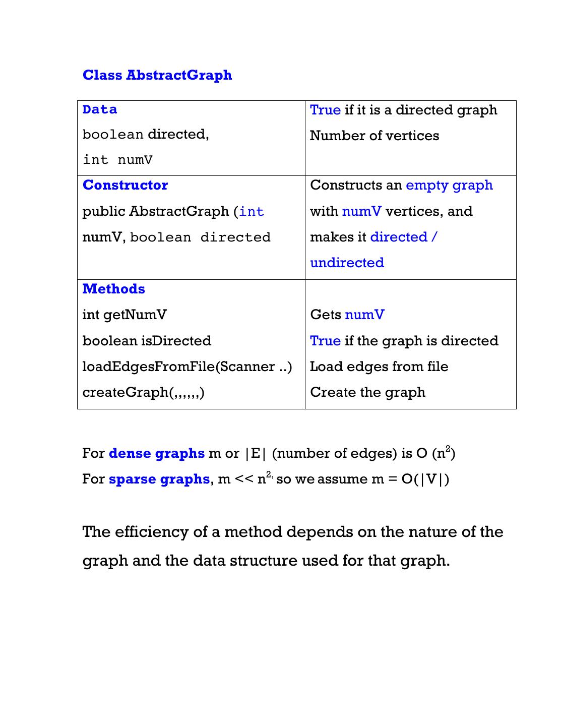 10 .Class AbstractGraph Data True if it is a directed graph boolean directed, Number of vertices int numV Constructor Constructs an empty graph public AbstractGraph (int with numV vertices, and numV, boolean directed makes it directed / undirected Methods int getNumV Gets numV boolean isDirected True if the graph is directed loadEdgesFromFile(Scanner ..) Load edges from file createGraph(,,,,,,) Create the graph For dense graphs m or |E| (number of edges) is O (n2) For sparse graphs, m << n2, so we assume m = O(|V|) The efficiency of a method depends on the nature of the graph and the data structure used for that graph.