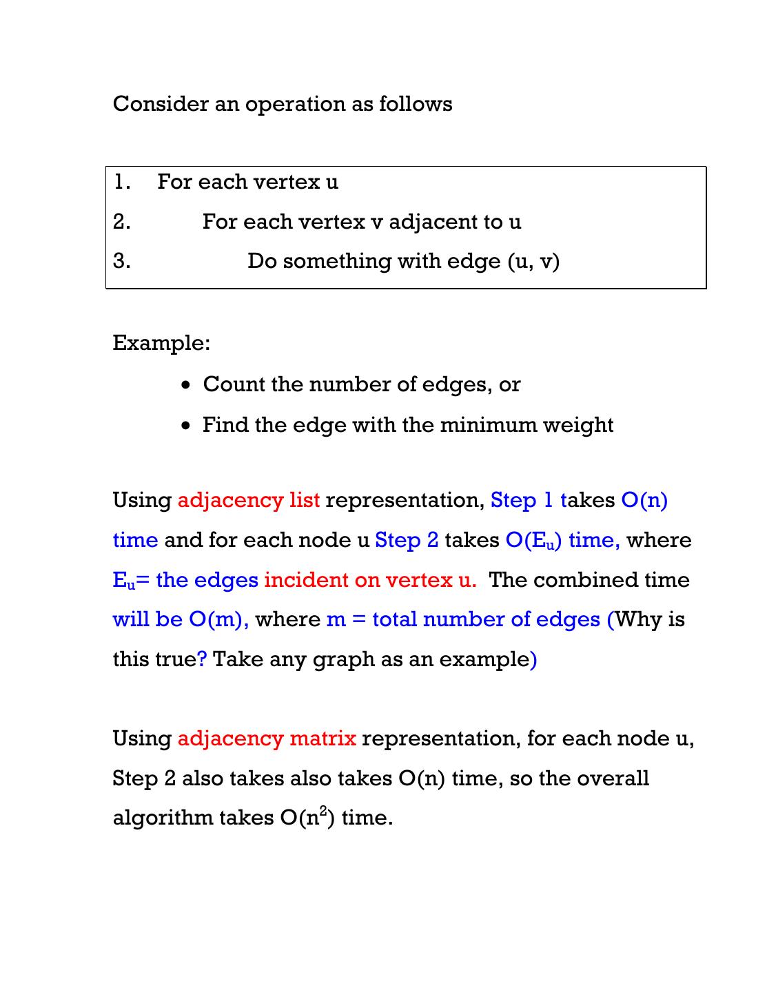 11 .Consider an operation as follows 1. For each vertex u 2. For each vertex v adjacent to u 3. Do something with edge (u, v) Example: • Count the number of edges, or • Find the edge with the minimum weight Using adjacency list representation, Step 1 takes O(n) time and for each node u Step 2 takes O(Eu) time, where Eu= the edges incident on vertex u. The combined time will be O(m), where m = total number of edges (Why is this true? Take any graph as an example) Using adjacency matrix representation, for each node u, Step 2 also takes also takes O(n) time, so the overall algorithm takes O(n2) time.