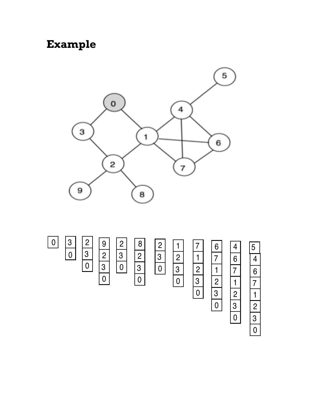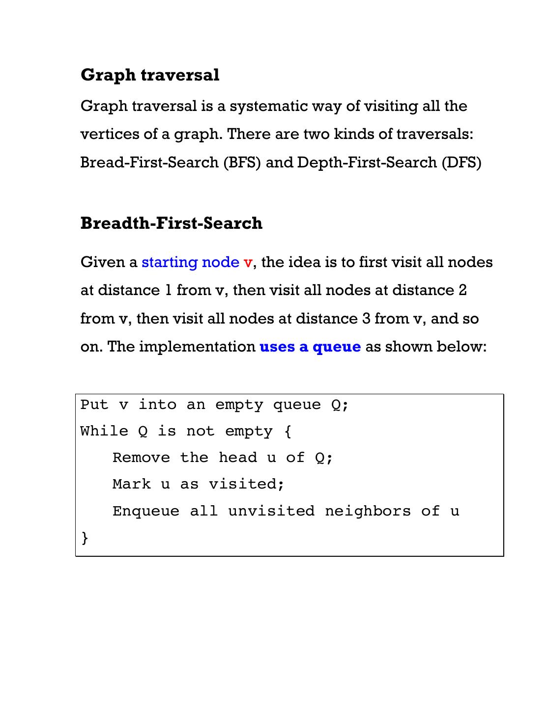 12 .Graph traversal Graph traversal is a systematic way of visiting all the vertices of a graph. There are two kinds of traversals: Bread-First-Search (BFS) and Depth-First-Search (DFS) Breadth-First-Search Given a starting node v, the idea is to first visit all nodes at distance 1 from v, then visit all nodes at distance 2 from v, then visit all nodes at distance 3 from v, and so on. The implementation uses a queue as shown below: Put v into an empty queue Q; While Q is not empty { Remove the head u of Q; Mark u as visited; Enqueue all unvisited neighbors of u }