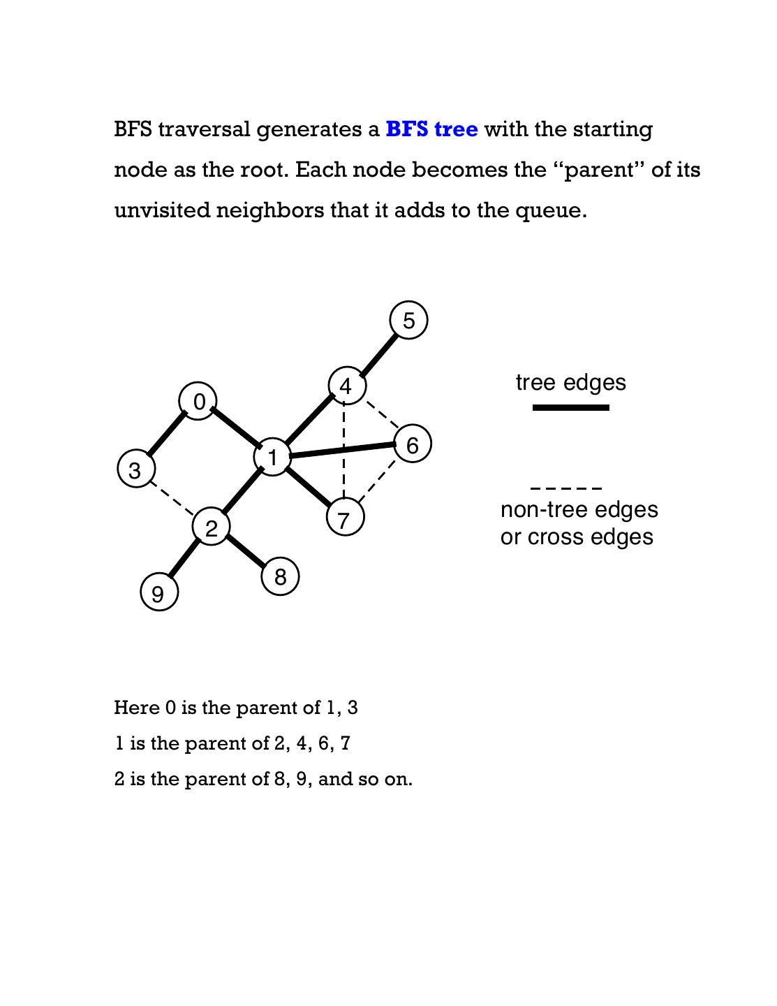 14 .BFS traversal generates a BFS tree with the starting node as the root. Each node becomes the “parent” of its unvisited neighbors that it adds to the queue. 5 4 tree edges 0 1 6 3 7 non-tree edges 2 or cross edges 8 9 Here 0 is the parent of 1, 3 1 is the parent of 2, 4, 6, 7 2 is the parent of 8, 9, and so on.