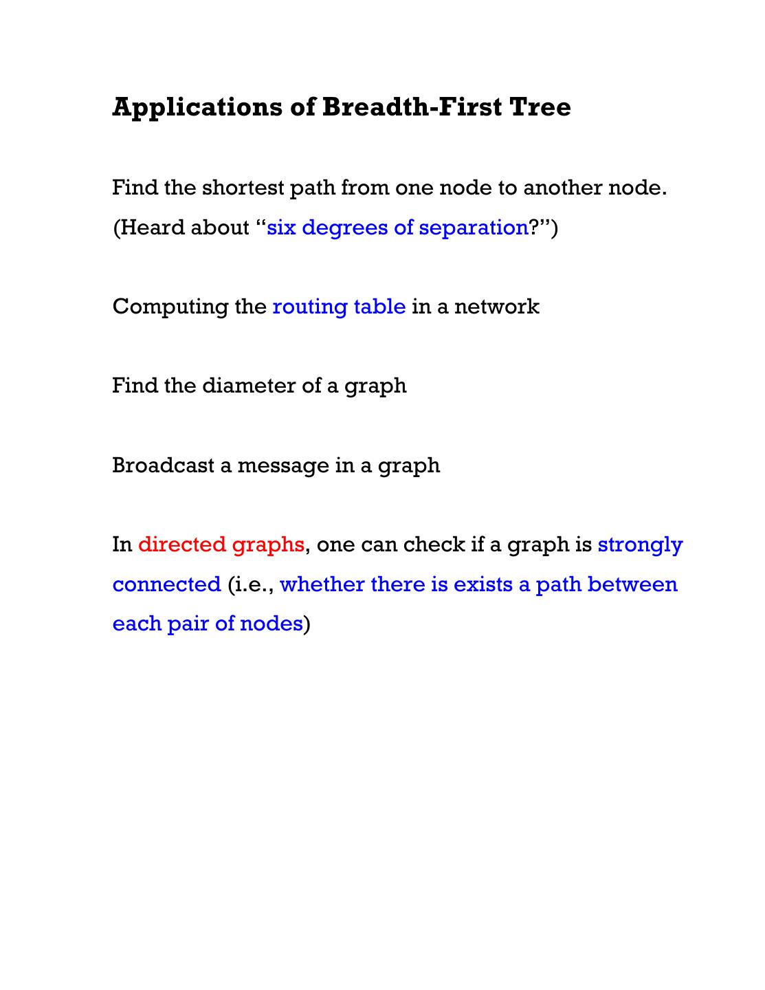 15 .Applications of Breadth-First Tree Find the shortest path from one node to another node. (Heard about “six degrees of separation?”) Computing the routing table in a network Find the diameter of a graph Broadcast a message in a graph In directed graphs, one can check if a graph is strongly connected (i.e., whether there is exists a path between each pair of nodes)