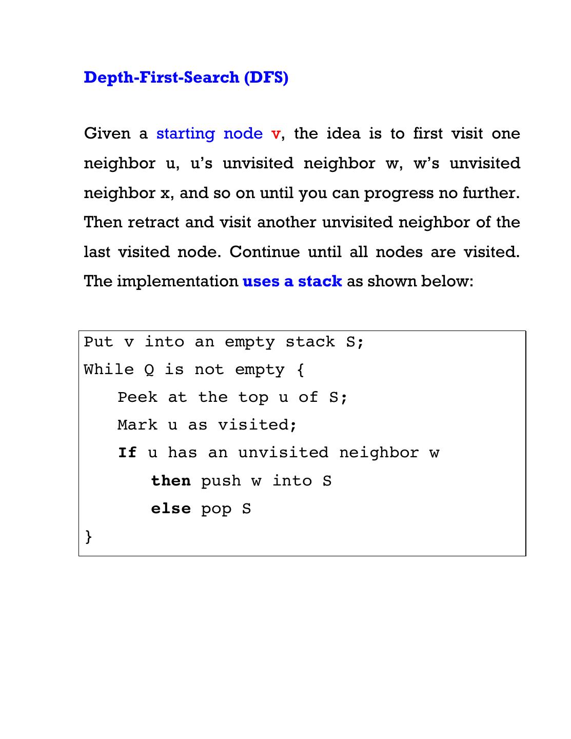 16 .Depth-First-Search (DFS) Given a starting node v, the idea is to first visit one neighbor u, u’s unvisited neighbor w, w’s unvisited neighbor x, and so on until you can progress no further. Then retract and visit another unvisited neighbor of the last visited node. Continue until all nodes are visited. The implementation uses a stack as shown below: Put v into an empty stack S; While Q is not empty { Peek at the top u of S; Mark u as visited; If u has an unvisited neighbor w then push w into S else pop S }