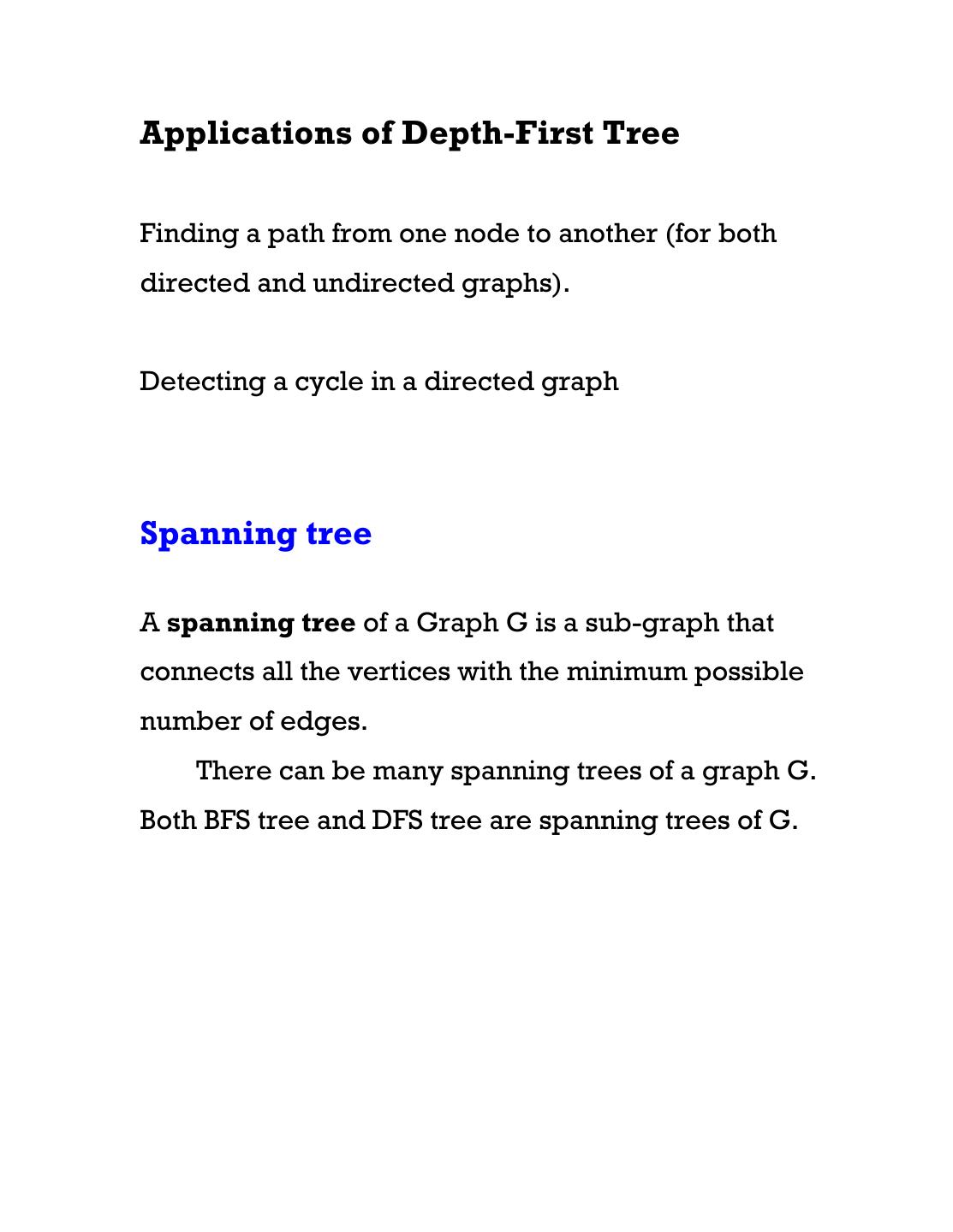19 .Applications of Depth-First Tree Finding a path from one node to another (for both directed and undirected graphs). Detecting a cycle in a directed graph Spanning tree A spanning tree of a Graph G is a sub-graph that connects all the vertices with the minimum possible number of edges. There can be many spanning trees of a graph G. Both BFS tree and DFS tree are spanning trees of G.