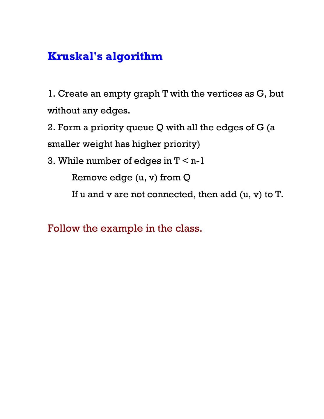 22 .Kruskal's algorithm 1. Create an empty graph T with the vertices as G, but without any edges. 2. Form a priority queue Q with all the edges of G (a smaller weight has higher priority) 3. While number of edges in T < n-1 Remove edge (u, v) from Q If u and v are not connected, then add (u, v) to T. Follow the example in the class.