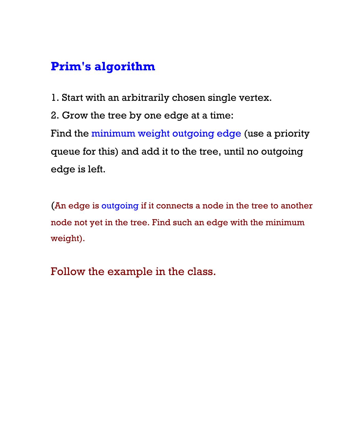 23 .Prim's algorithm 1. Start with an arbitrarily chosen single vertex. 2. Grow the tree by one edge at a time: Find the minimum weight outgoing edge (use a priority queue for this) and add it to the tree, until no outgoing edge is left. (An edge is outgoing if it connects a node in the tree to another node not yet in the tree. Find such an edge with the minimum weight). Follow the example in the class.